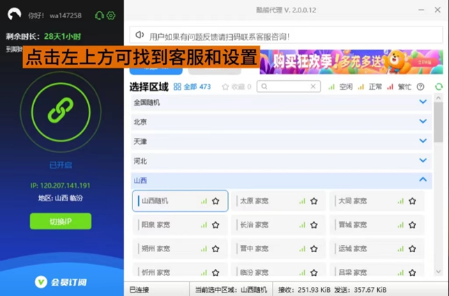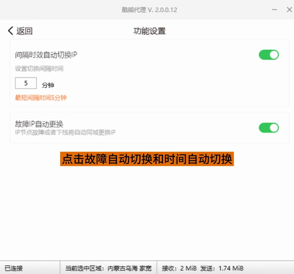5:开启故障自动切换,即当服务器意外断开连接时,系统自动切换能有效避免本地网络泄露。开启间隔时间自动切换,可以设置时长,到时间自动切换IP