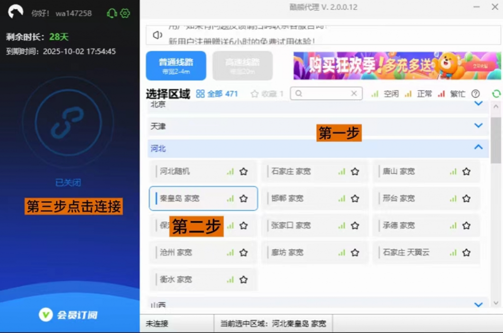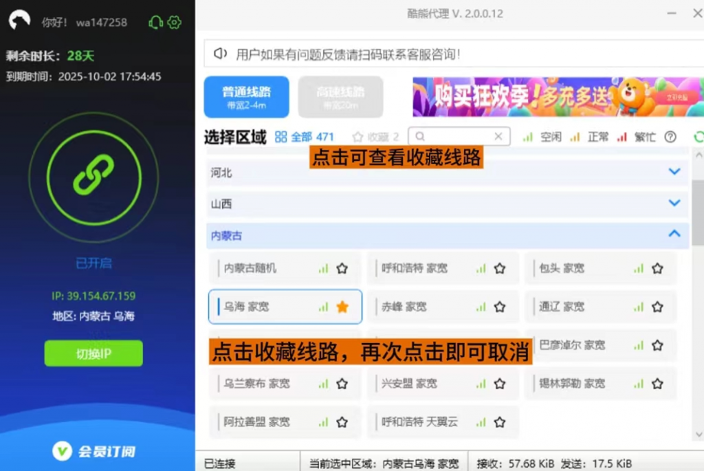 2:在首页选择所需线路,选中线路,点击“连接”即可
