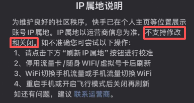 基于以上对于快手的ip地址有一个基础的概念和认知,我们也可以知道快手主页ip归属地没有在哪里改这种说法,官方明确说了不支持修改和关闭。