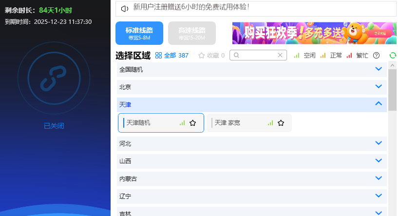 我们再回过头来看软件,软件本身的使用并不难,唯一值得注意的就是,先选城市节点,再连接网络,不要一上来猴急直接开始使用,再有就是一定要让app保持在后台运行,PC电脑端使用同理。