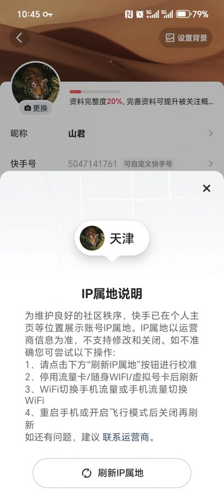 先按下这个问题,我在后面再给大家说说,我们先来快手app上看一下这个教程到底有没有效果,可以看到我这里不管怎么刷新都还是显示ip属地是重庆,也就是说这个教程毫无作用。