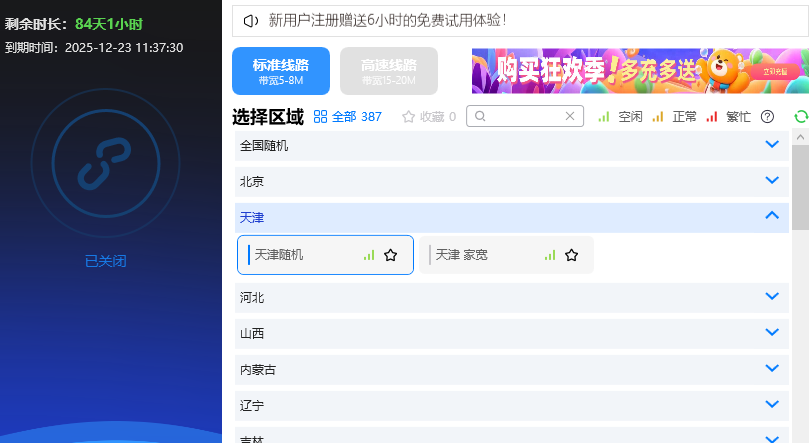 废话不多说,我们直接上今天的重头戏,直接上软件,通过软件界面一目了然,就是分为两个版块,右边这一块负责选择和展示所支持的城市网络节点,左边则负责是否连接我们所选择的城市网络节点。